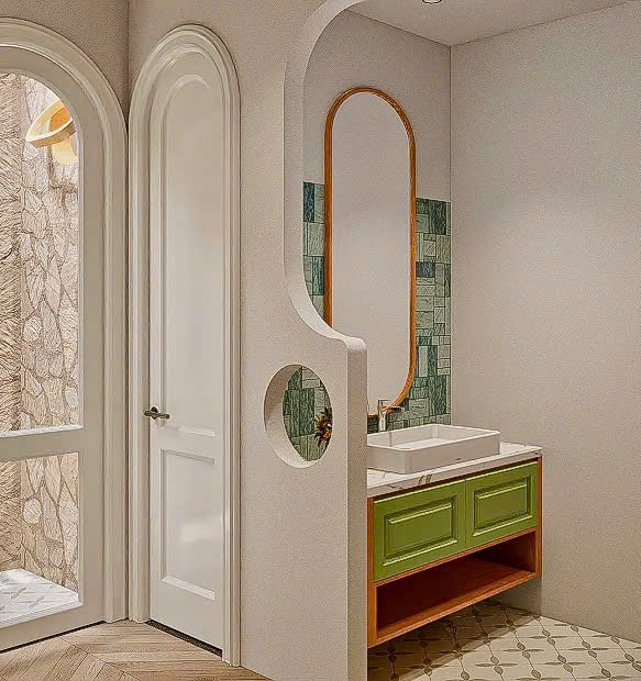 - Toàn bộ không gian sử dụng các chi tiết bo tròn và vòm cong (Arch), từ cửa ra vào, vách ngăn phòng tắm, đến gương soi trang trí, tạo cảm giác mềm mại, tinh tế và loại bỏ sự khô cứng của kiến trúc nhà phố.