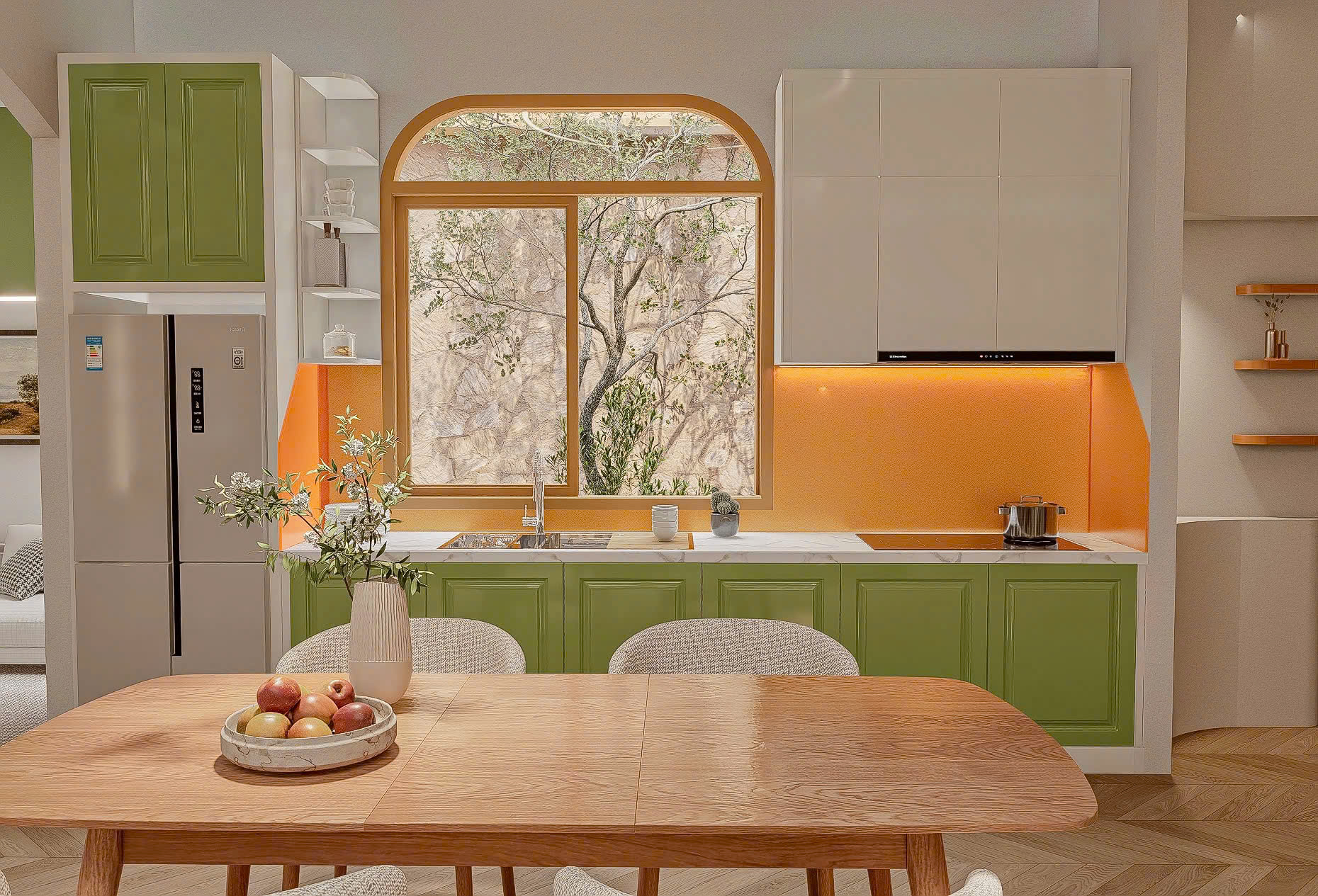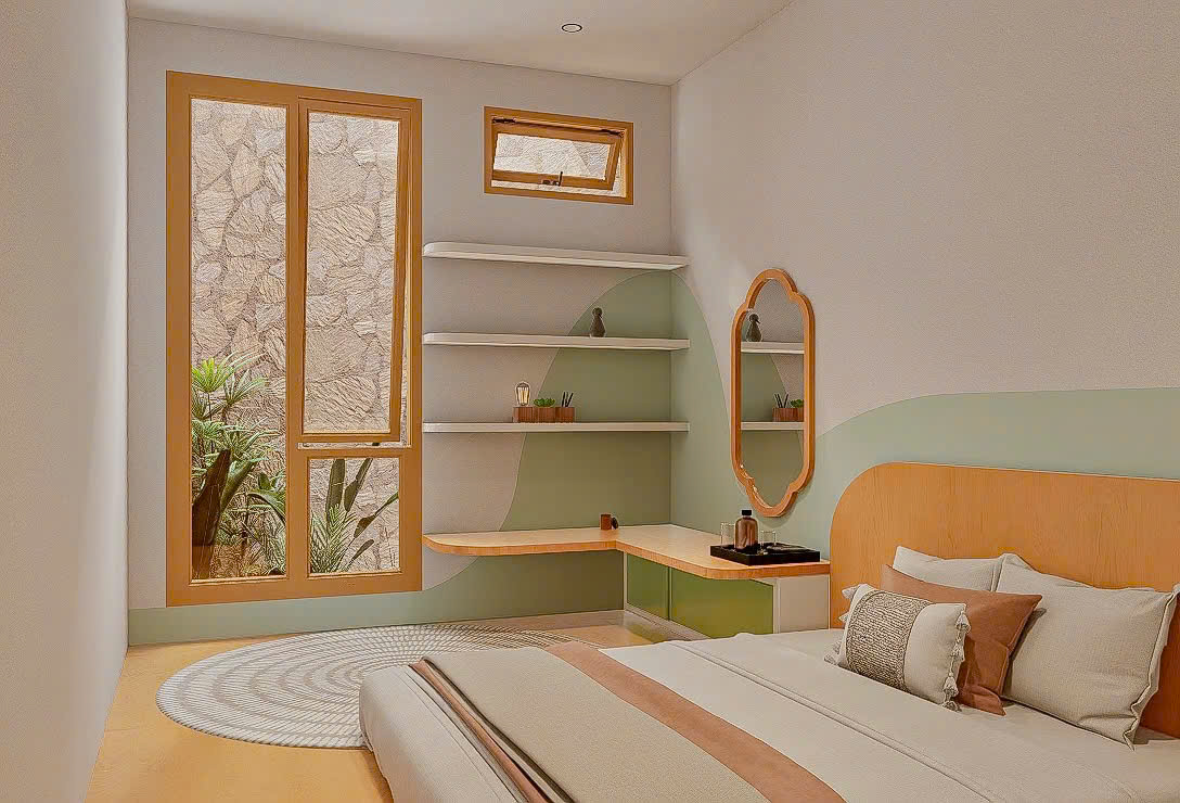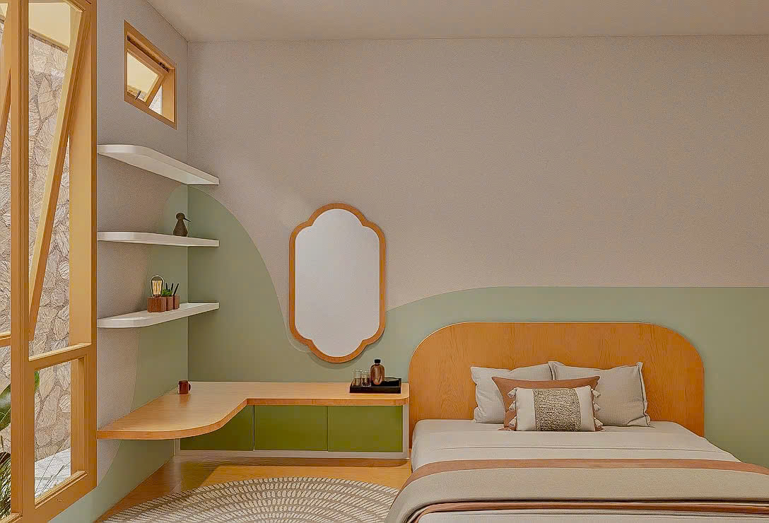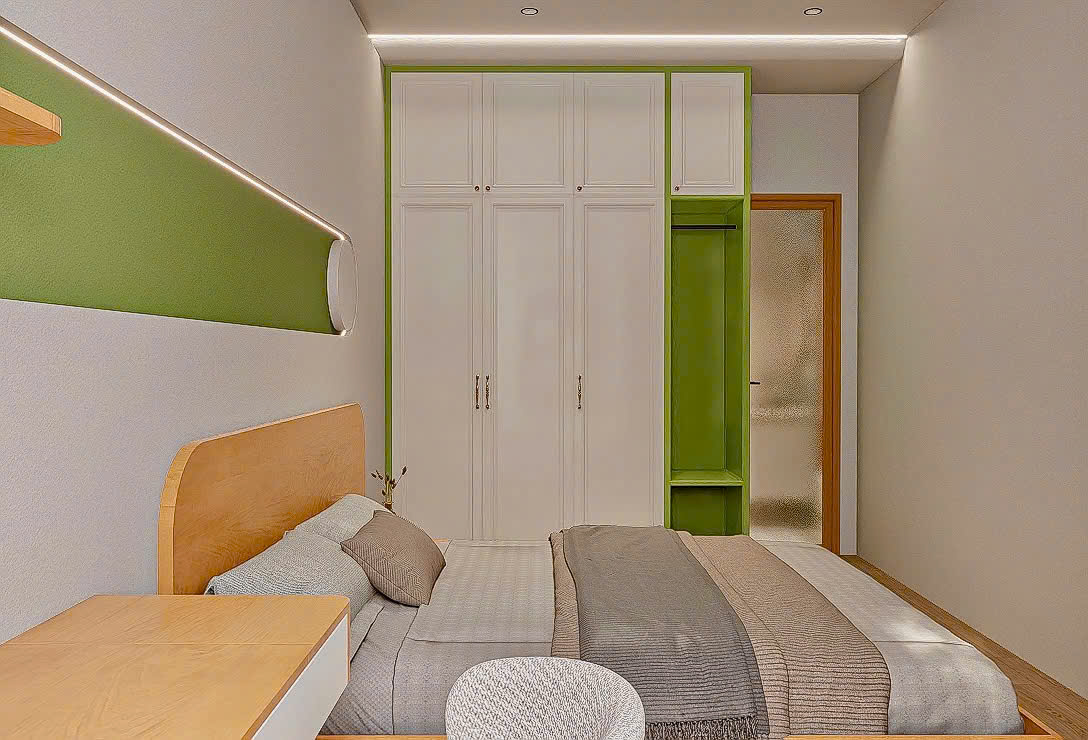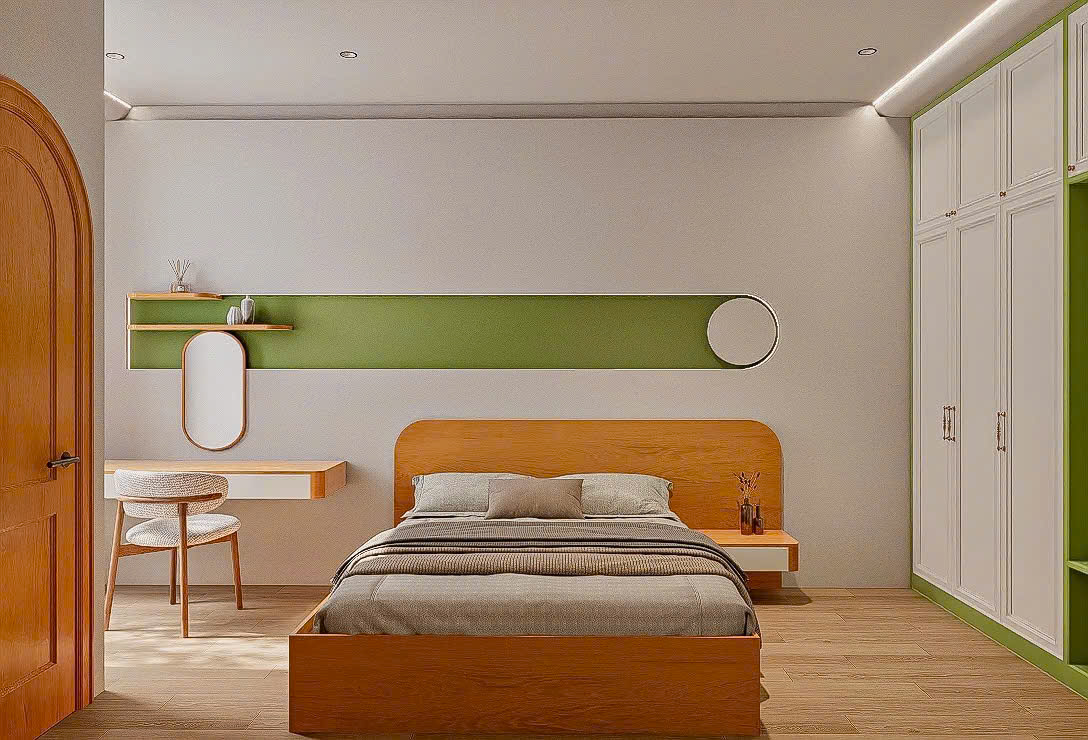 - Palette màu: Sử dụng tông màu chủ đạo Trắng – Be kết hợp với màu Xanh Lá Cây Olive (Greenery) và các mảng màu Cam Đất/Hồng Đất nổi bật. Sự pha trộn này tạo nên không gian trẻ trung, ấm áp và thư giãn.