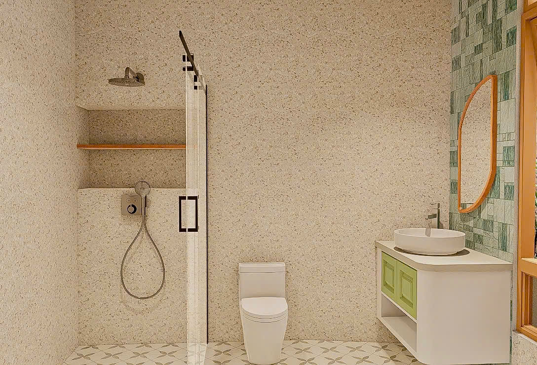 - Phòng Tắm – Spa Tại Gia: Không gian phòng tắm được nâng tầm với gạch mosaic xanh ngọc lấp lánh, tủ lavabo thiết kế riêng biệt và các chi tiết bo cong mềm mại, biến mỗi khoảnh khắc chăm sóc bản thân thành liệu trình spa thư giãn.