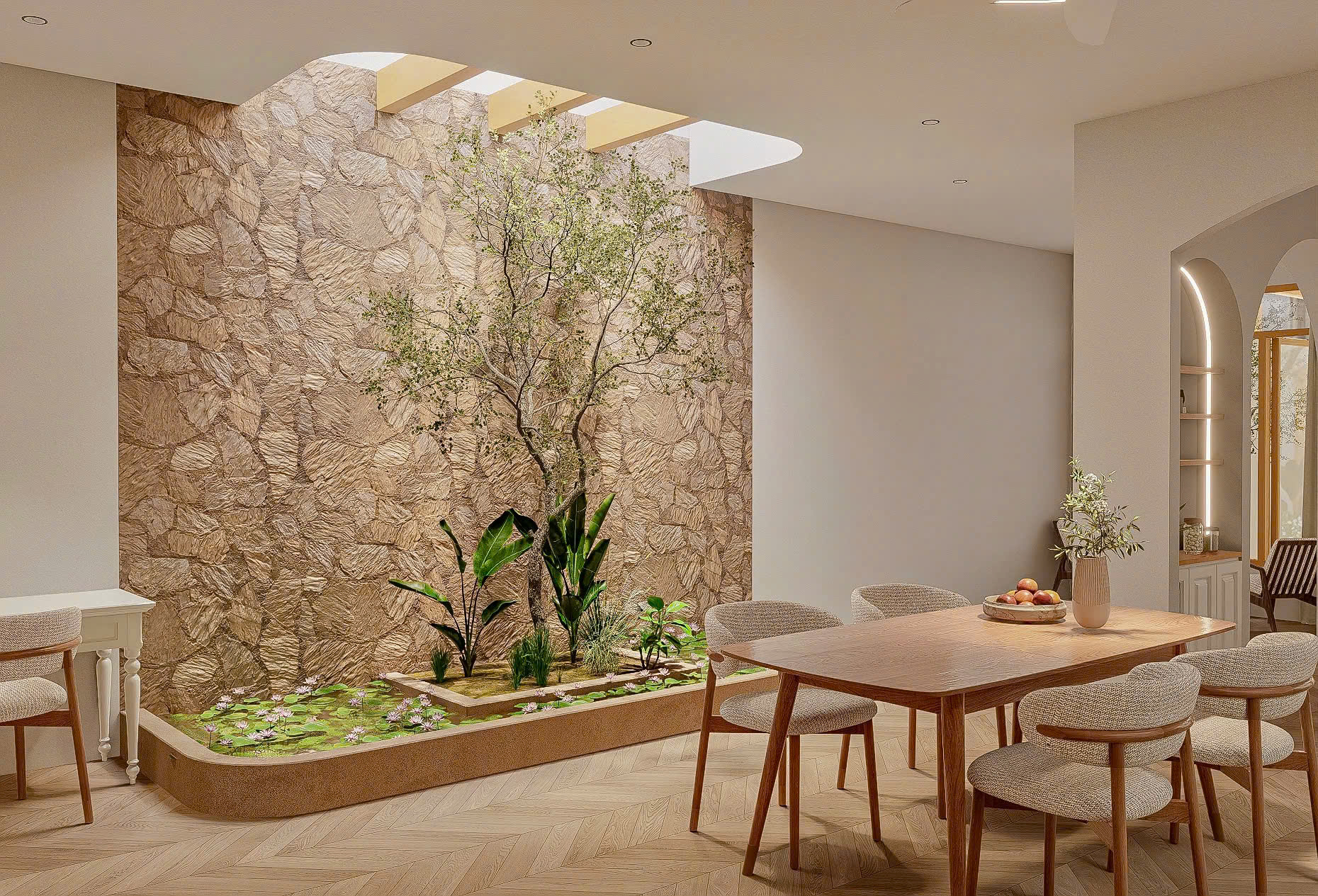 - “Ốc Đảo Xanh” Giữa Lòng Nhà: Tiểu cảnh trung tâm không chỉ là một giếng trời mà là một “lá phổi xanh,” mang hơi thở của cây cối và làn gió mát lành vào tận sâu trong từng căn phòng. Tường đá tự nhiên sần sùi đối lập với thảm thực vật xanh tươi, tạo nên một điểm nhấn ấn tượng, xoa dịu mọi giác quan.