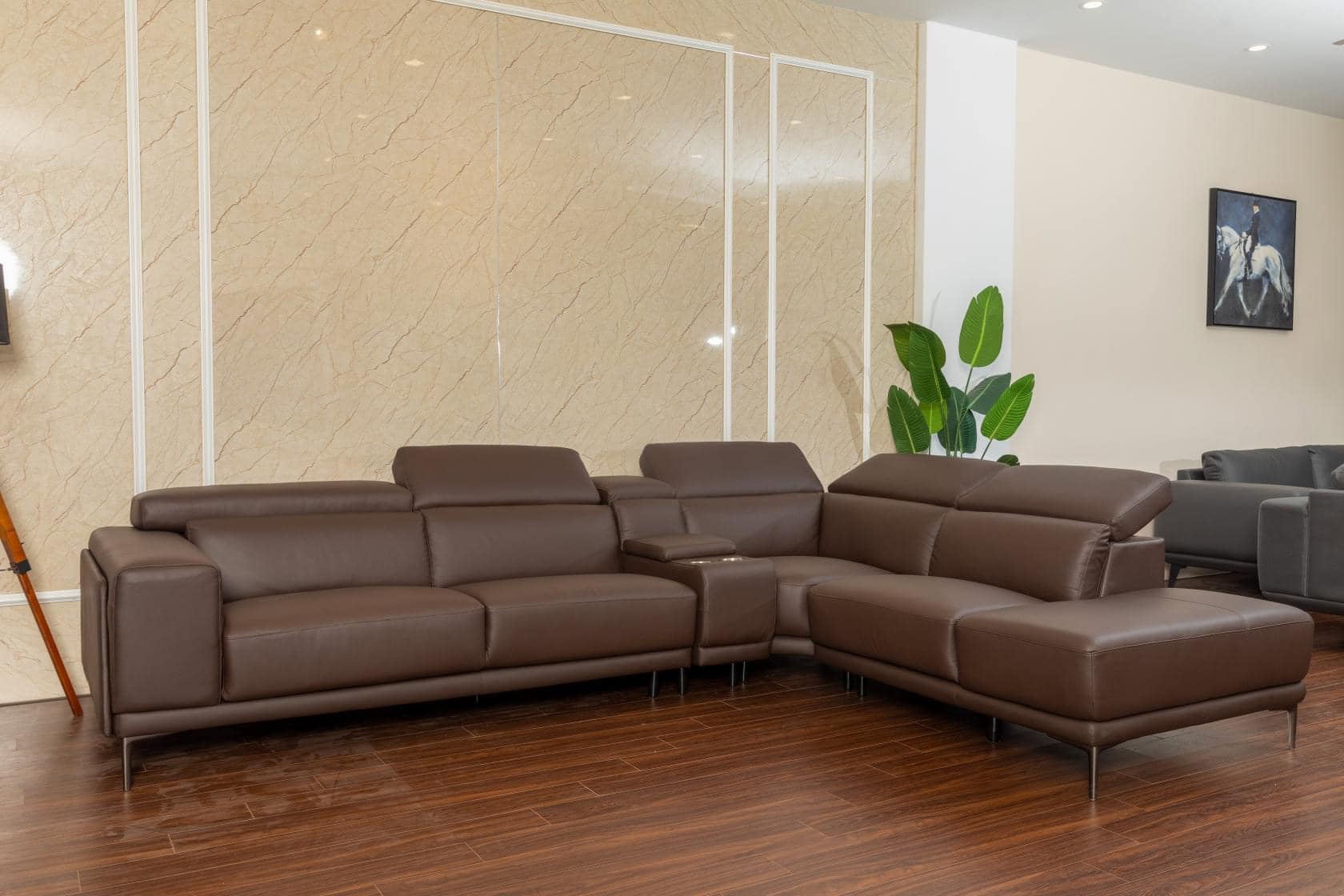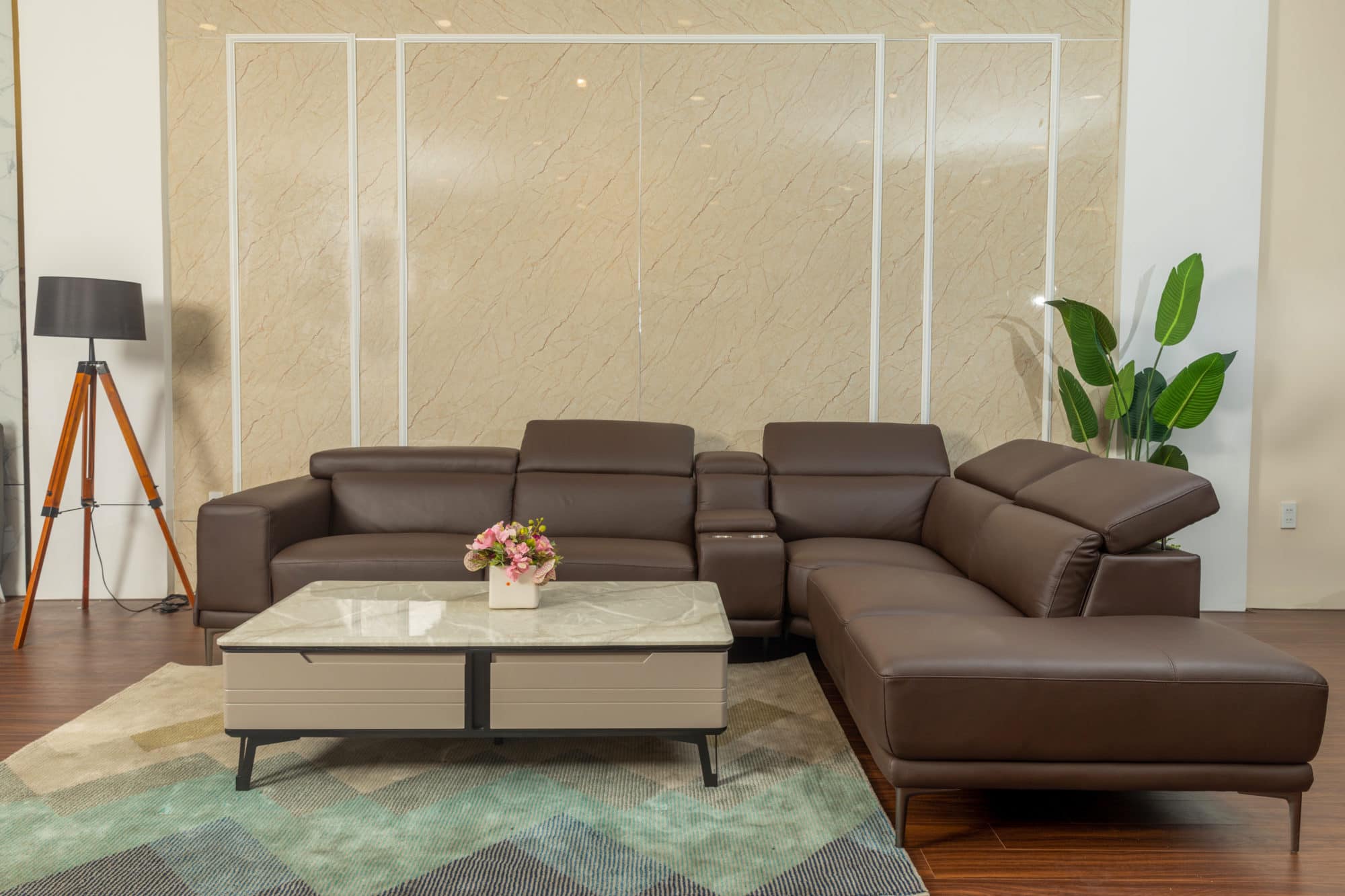 Bộ sofa được bọc hoàn toàn bằng da thật cao cấp, nổi bật với gam màu nâu sô-cô-la ấm áp và lịch lãm.